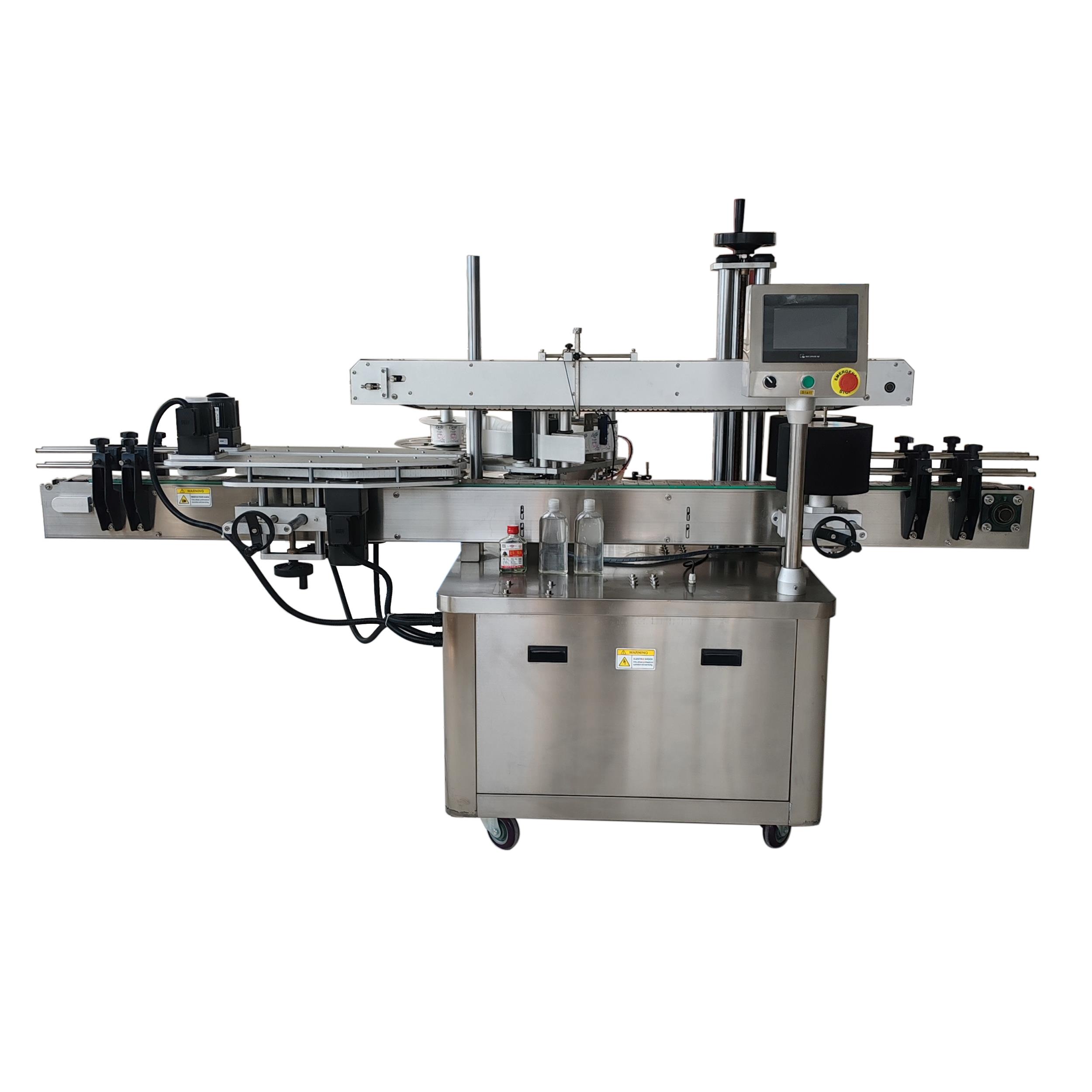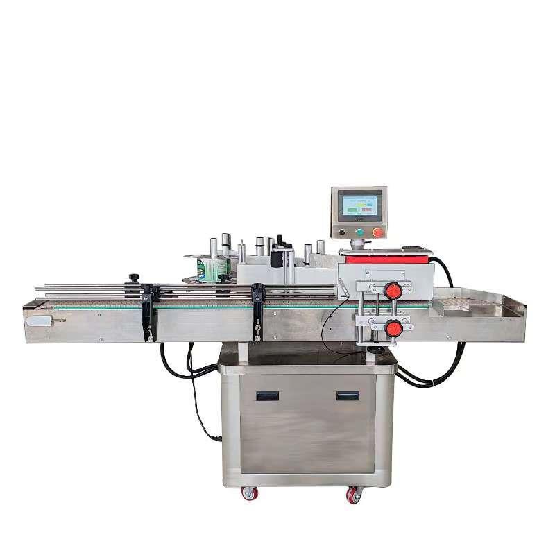 全自動平面雙面不干膠貼標機能自動把標簽貼到瓶子的指定位置,適合方瓶貼單面,,如洗潔精瓶 洗衣液瓶,酒瓶,本機可以搭配色帶打碼機或噴碼機,同時完成打印批號,日期,產量計數,在遇到缺瓶時,控制系統保證不送標,有效的防止標簽的浪費,并可根據各廠的生產特點對貼標速度…